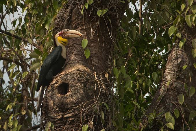 The great hornbill female finds a tree cavity, enters it, and then — with help from her mate — seals herself inside. Using mud, droppings, and food debris, she plasters the entrance until only a narrow slit remains. She stays in that cavity for up to four months while incubating eggs and raising chicks, fed through the slit by her mate the entire time.